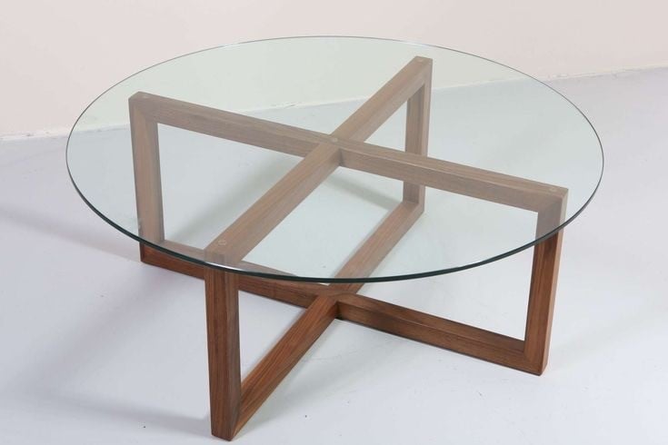 طاولة قهوة بسطح زجاج وقاعدة ثابتة باللون الخشبي :